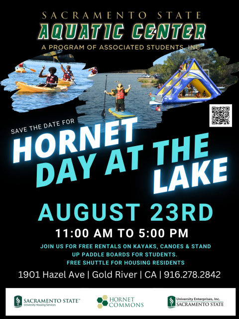 Join the Aquatic Center on August 23, 2025 from 11:00 AM to 5:00 PM to kick off the Fall semester with Hornet day at the Lake.