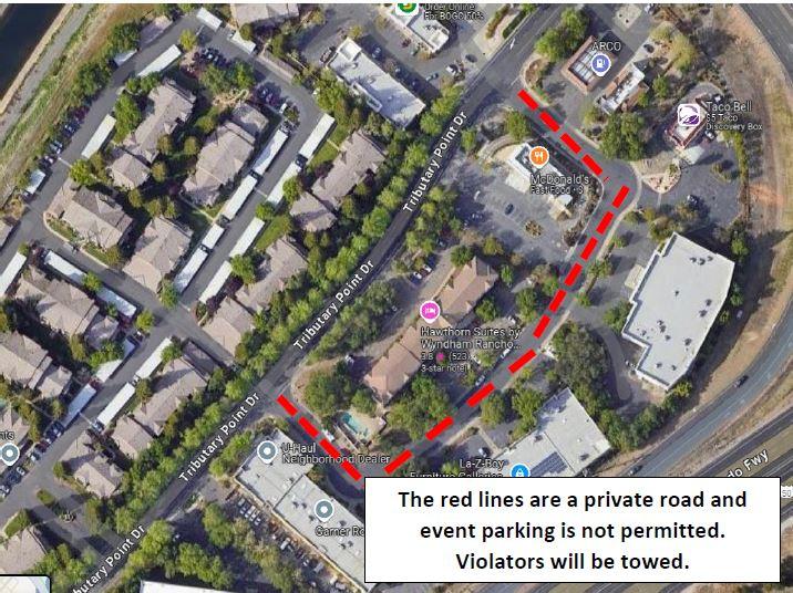 Parking on the street of Tributary Lane is prohibited, as this is a private road and vehicles will be towed.